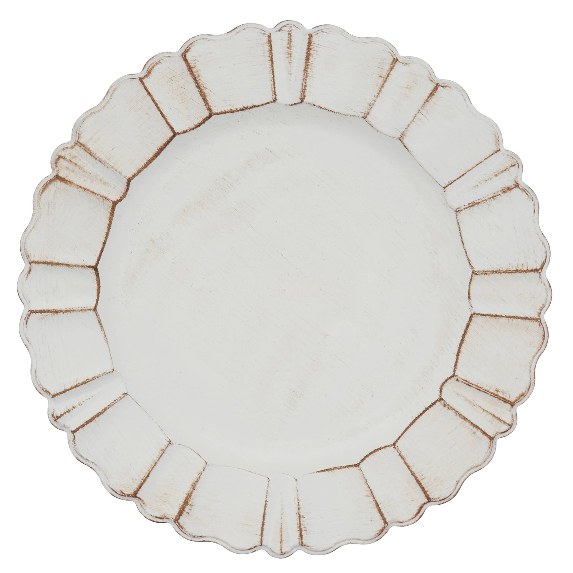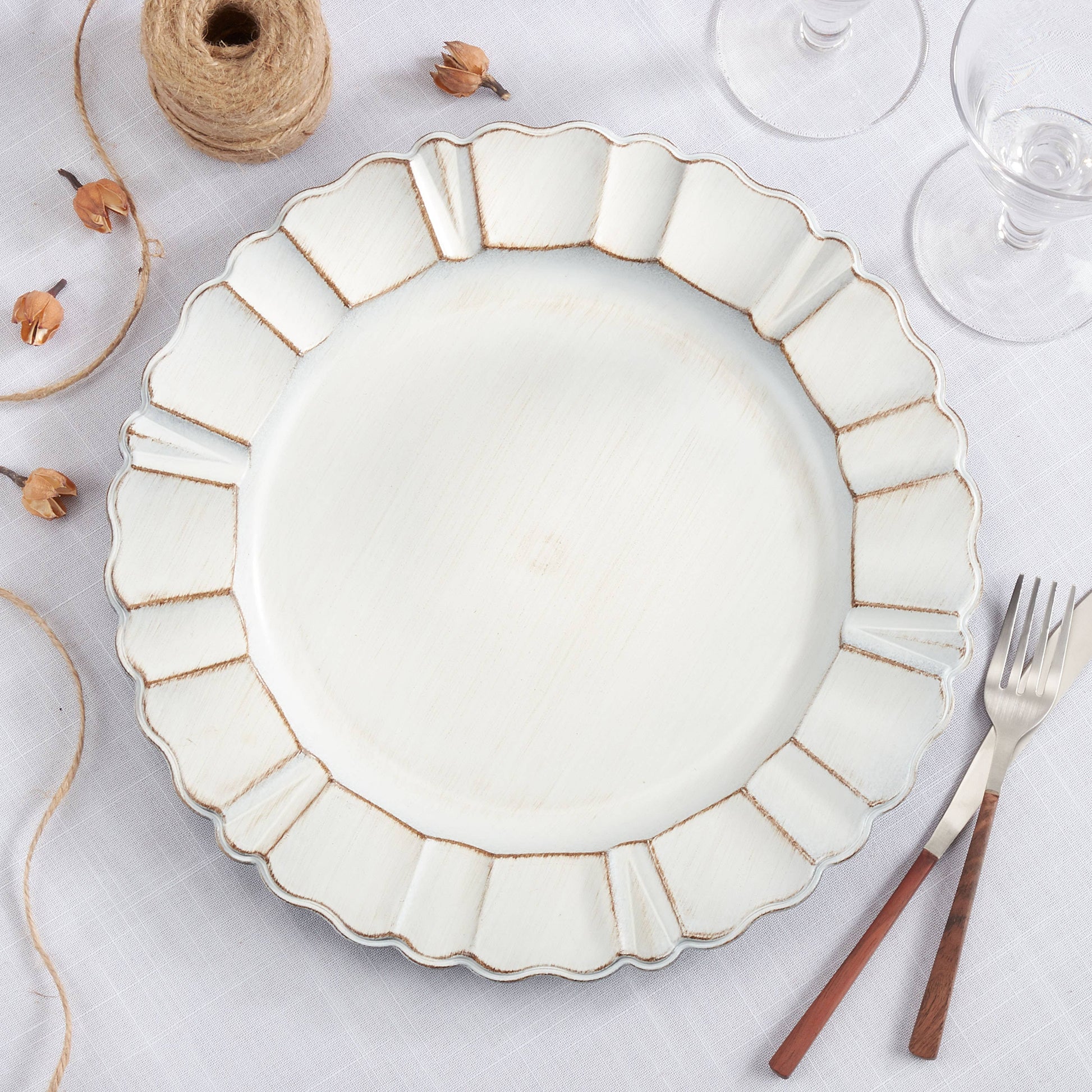 Bring your table décor to the next level with these gorgeous Scalloped Ruffled Charger Plates. Featuring a light, ivory finish, and shaped with an antiqued scalloped trim, the round charger plates add a graceful note. Pair with elegant dinnerware and cotton or linen table napkins.