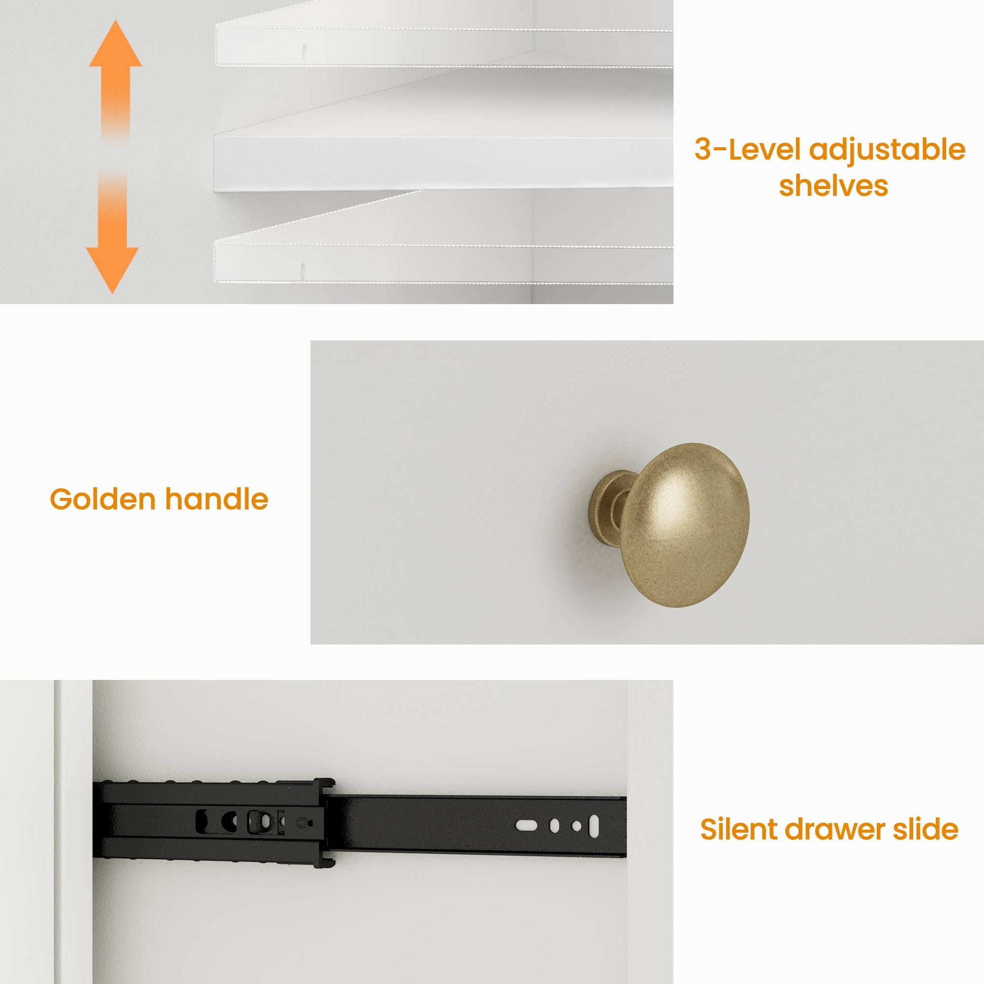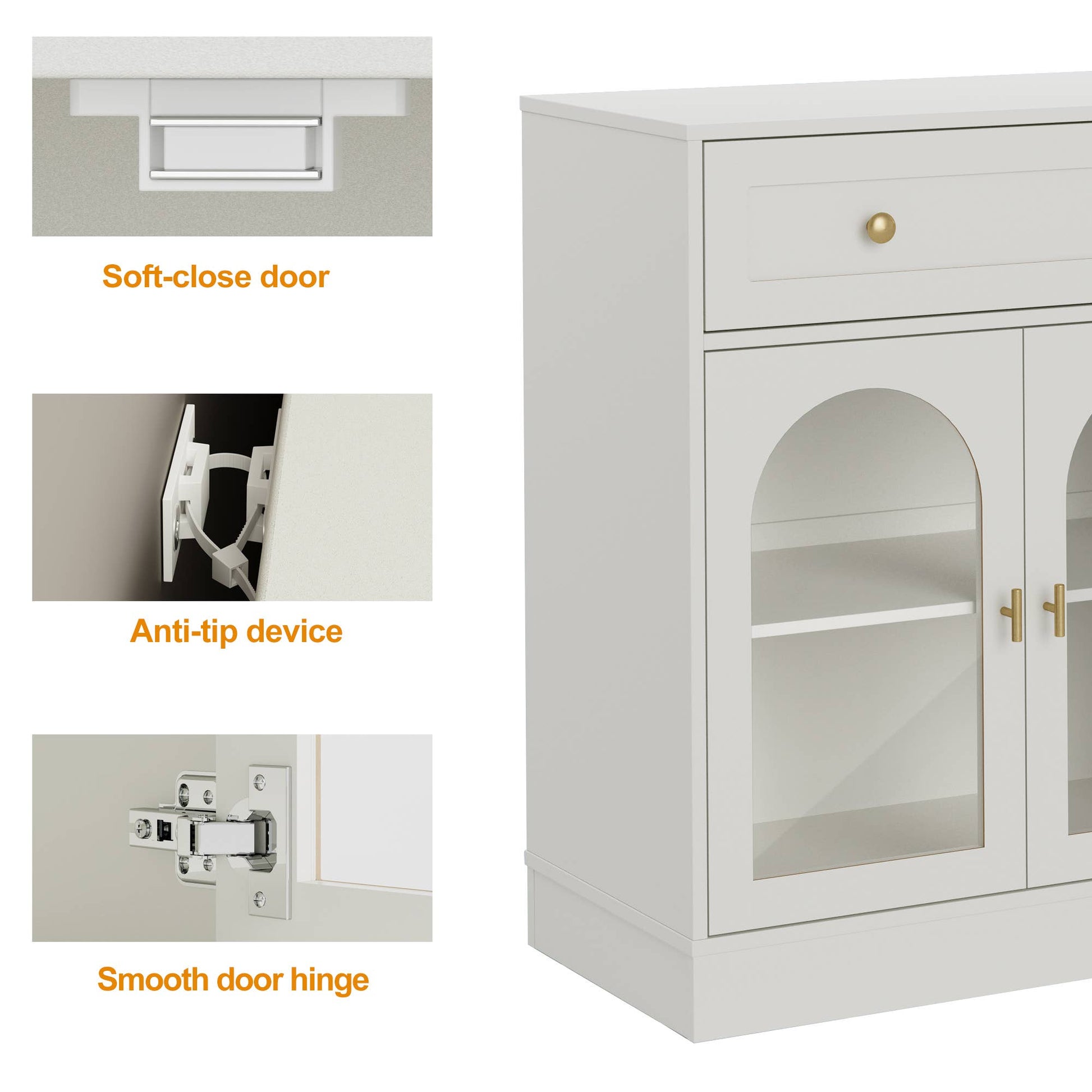 This versatile storage cabinet perfectly combines style and functionality. Spacious drawers and adjustable shelves offer ample storage for snacks, small items, and décor. The unique arch-shaped acrylic doors and gold handles add elegance and modern flair to your home. With quiet glide tracks and soft-closing doors, it operates silently. Made from eco-friendly materials, it’s durable and stable, making it the ideal choice for a tidy and stylish living space.