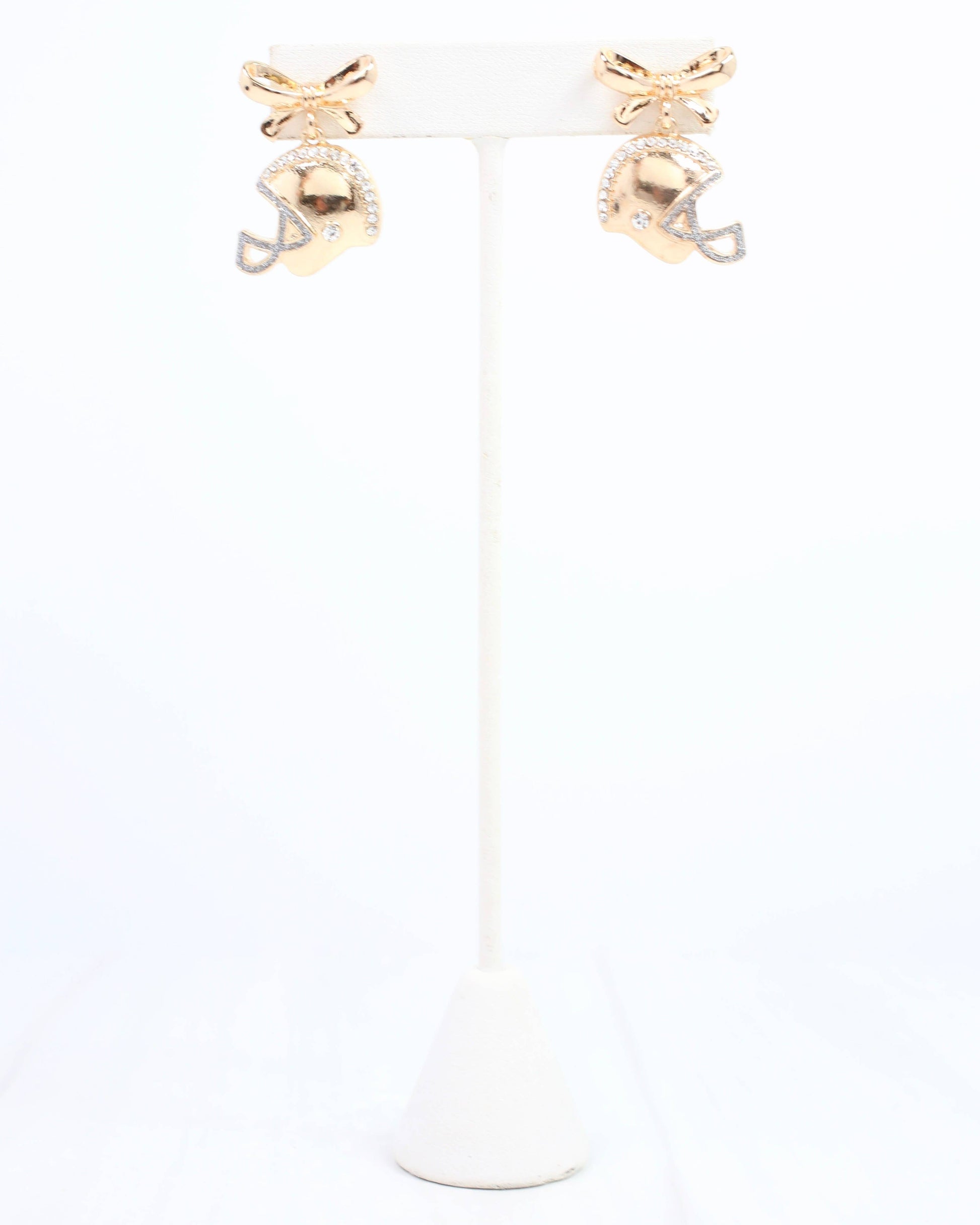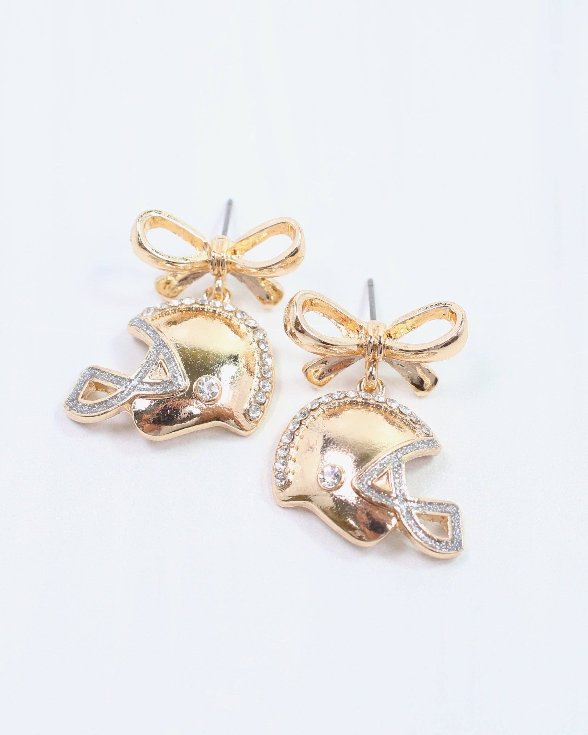 Add a playful touch to your look with these Sporty Bow Helmet Earrings in gleaming gold. Each earring features a shiny football helmet charm, accented with sparkling CZ trim, hanging from a delicate gold bow stud. Perfect for showing off your team spirit with a fun and feminine twist.