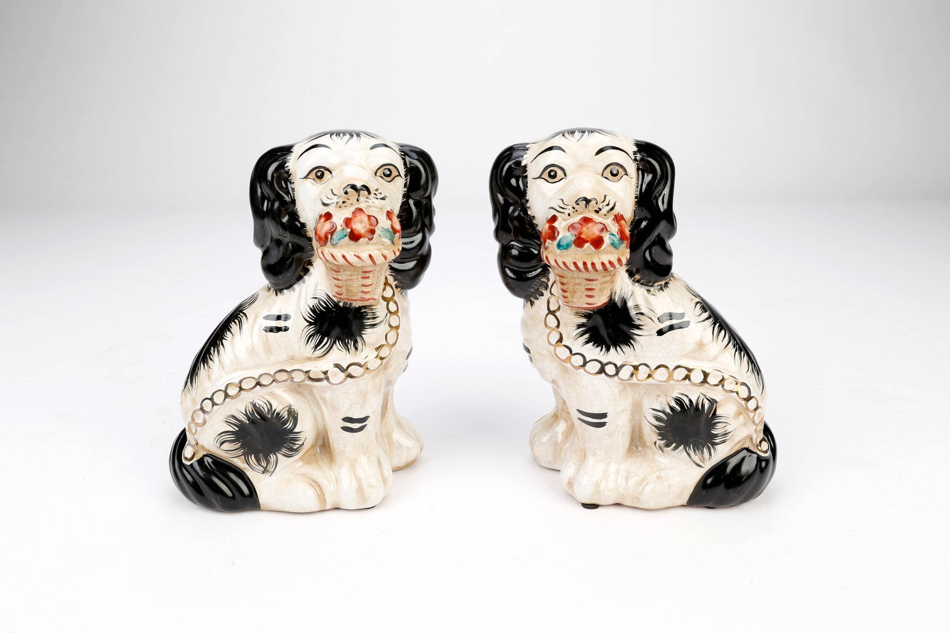 Staffordshire Dog Pair with Flower Baskets, Black and White with Brown Glazed Finish. These black and white Staffordshire-style dogs have flower baskets in their mouths and are accented with gold collars and chains.