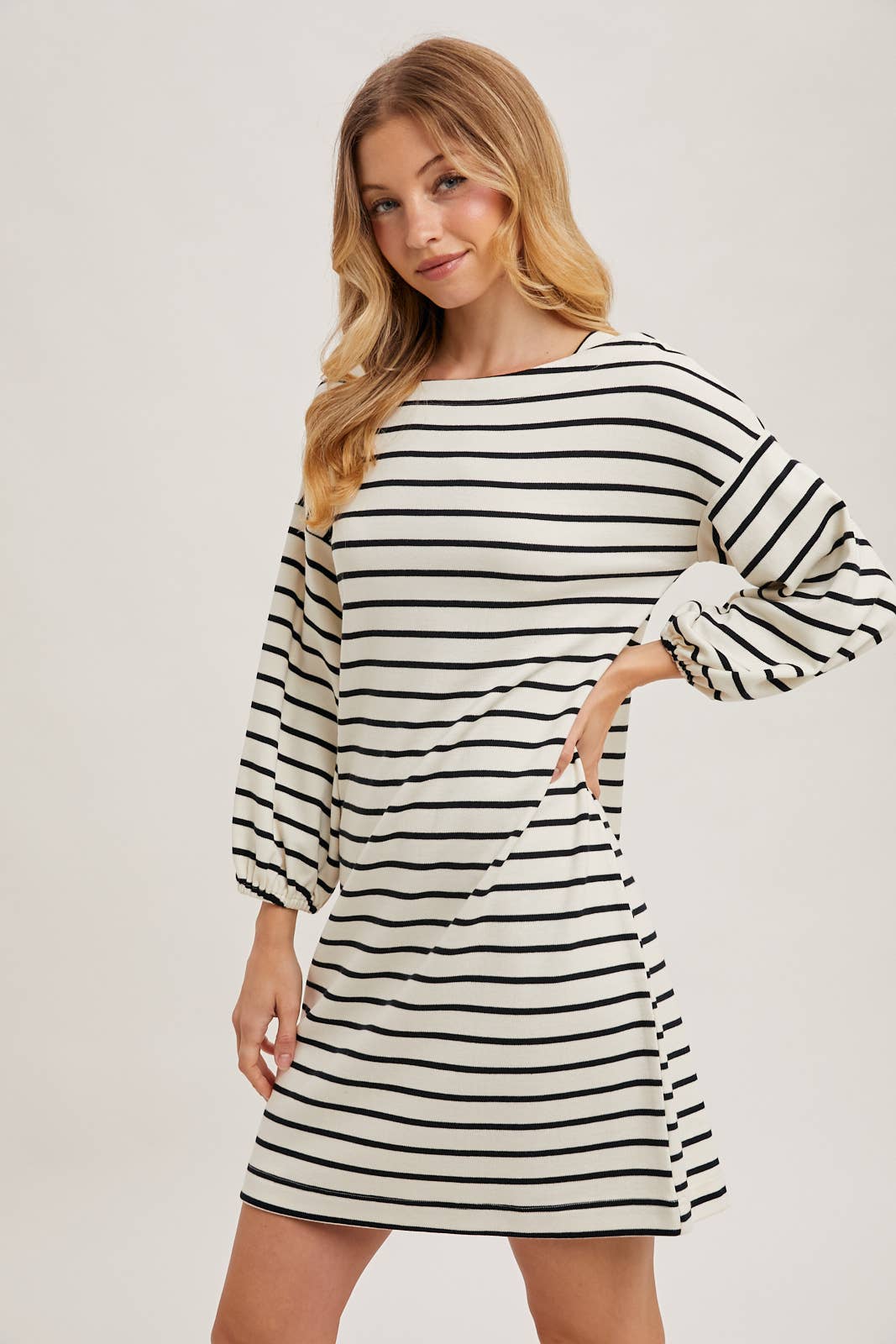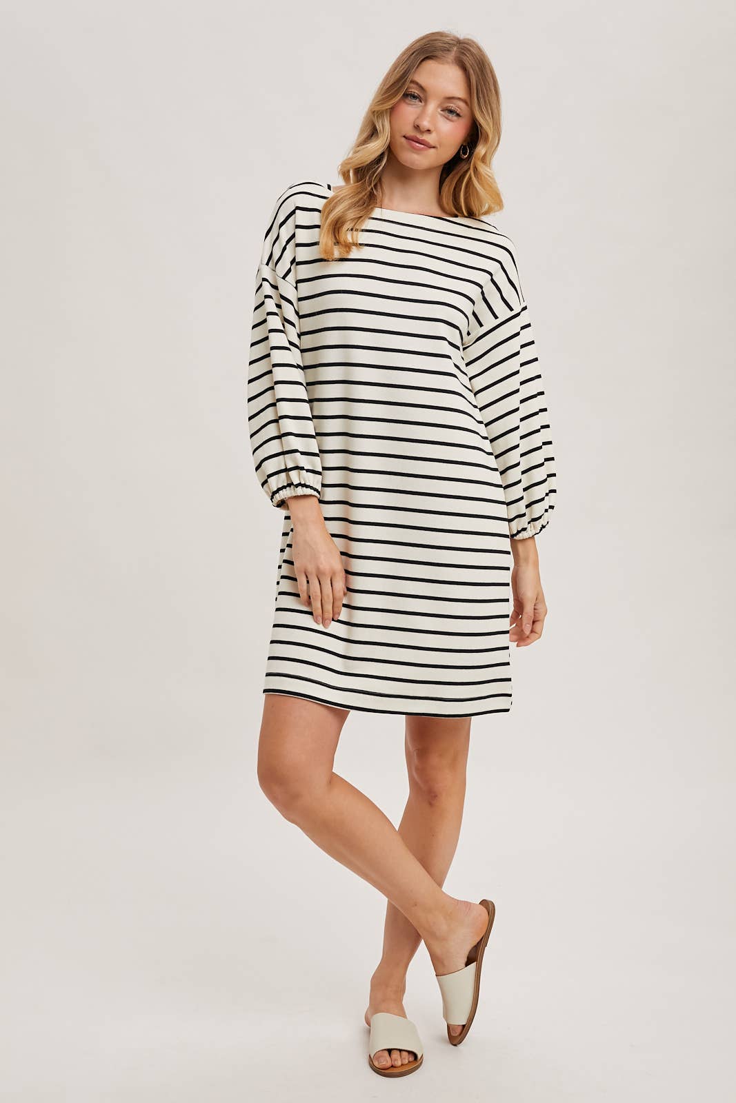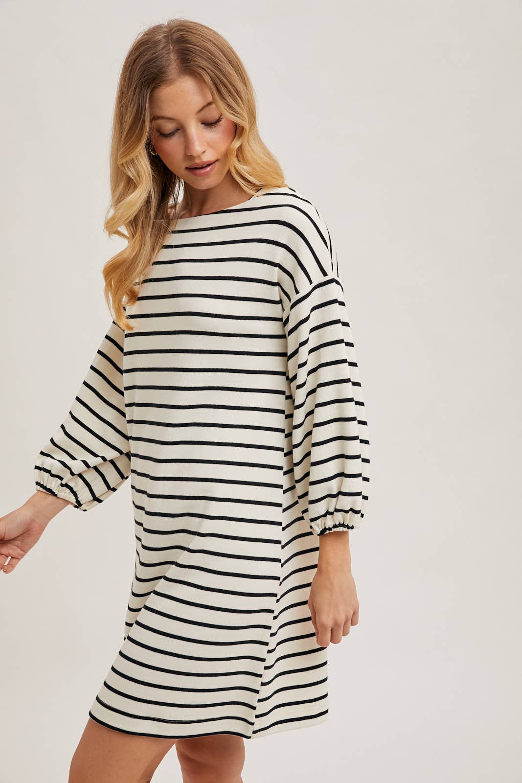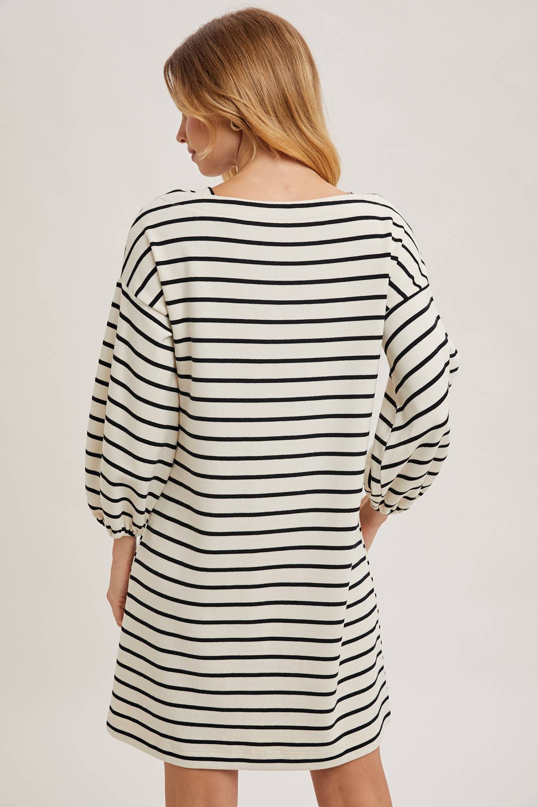 The striped 3/4 sleeved knit dress offers a cozy yet stylish look, perfect for any casual occasion. Made with soft, stretchy knit fabric, this dress provides comfort and a flattering fit. The classic striped pattern adds a timeless appeal, while the 3/4 length sleeves provide a balanced look suitable for various seasons. Ideal for layering or wearing solo, this versatile dress can be paired with sneakers or ankle boots for an effortlessly chic style.