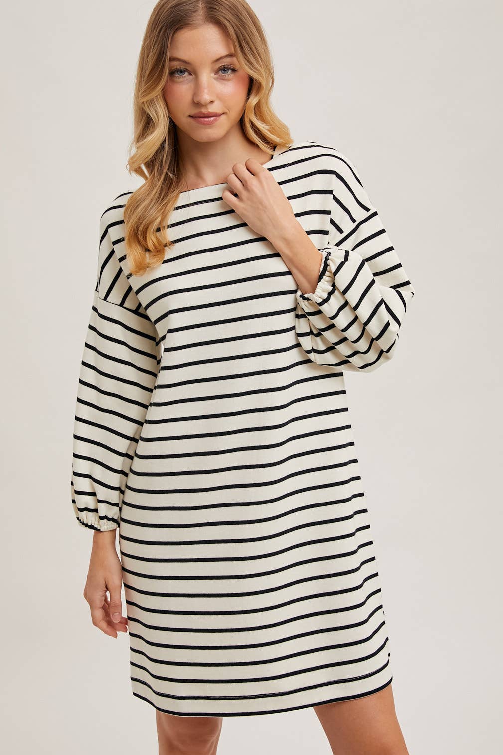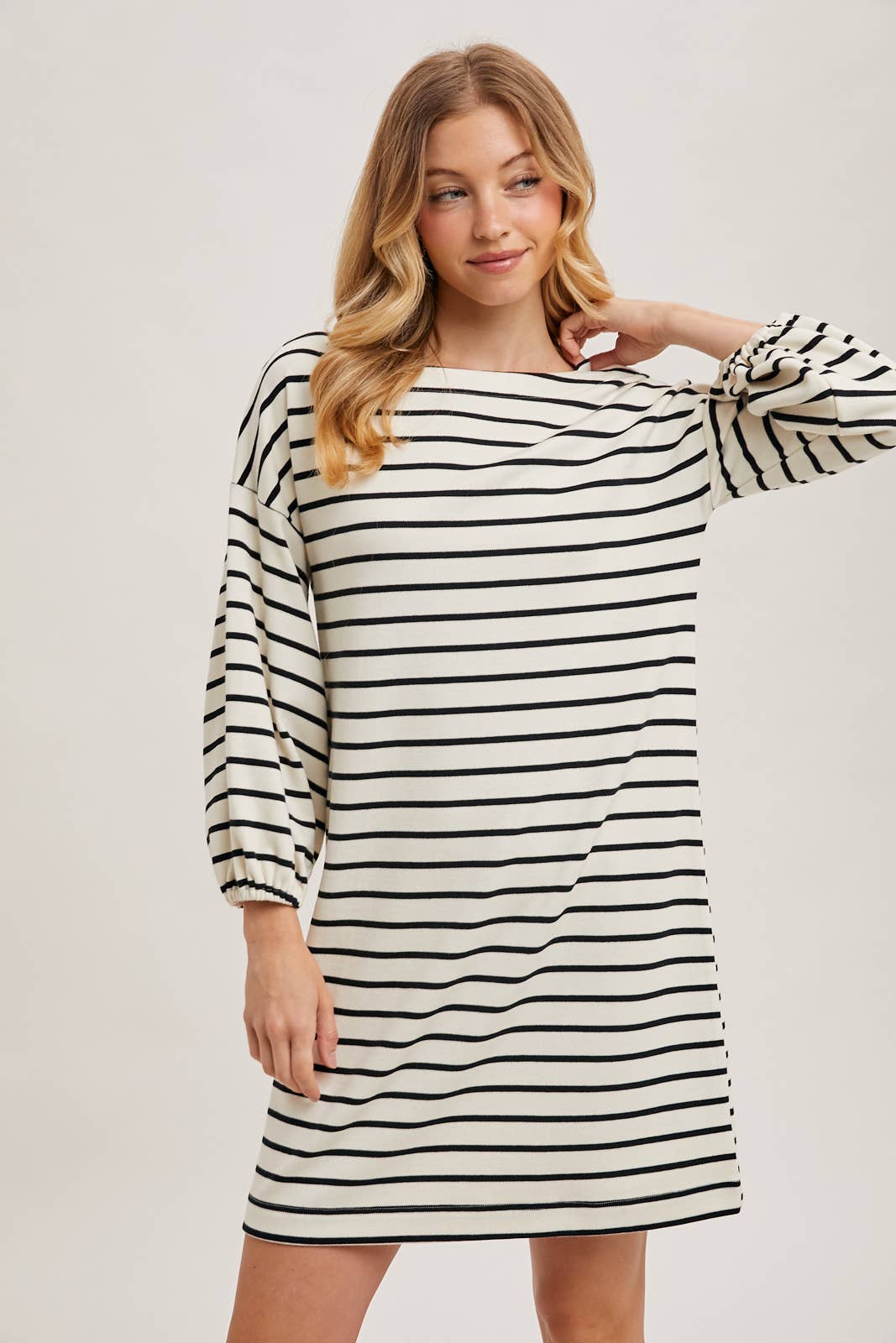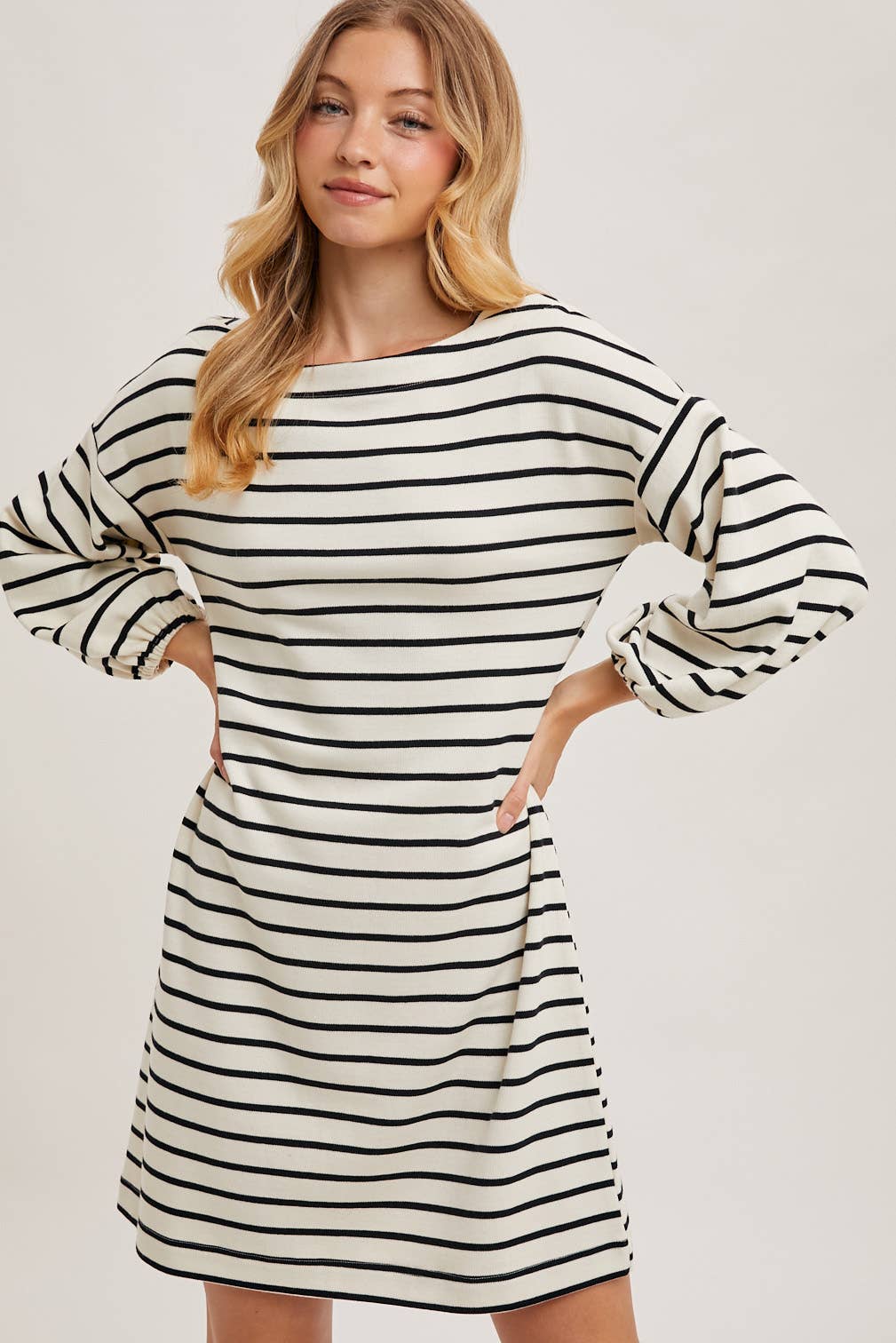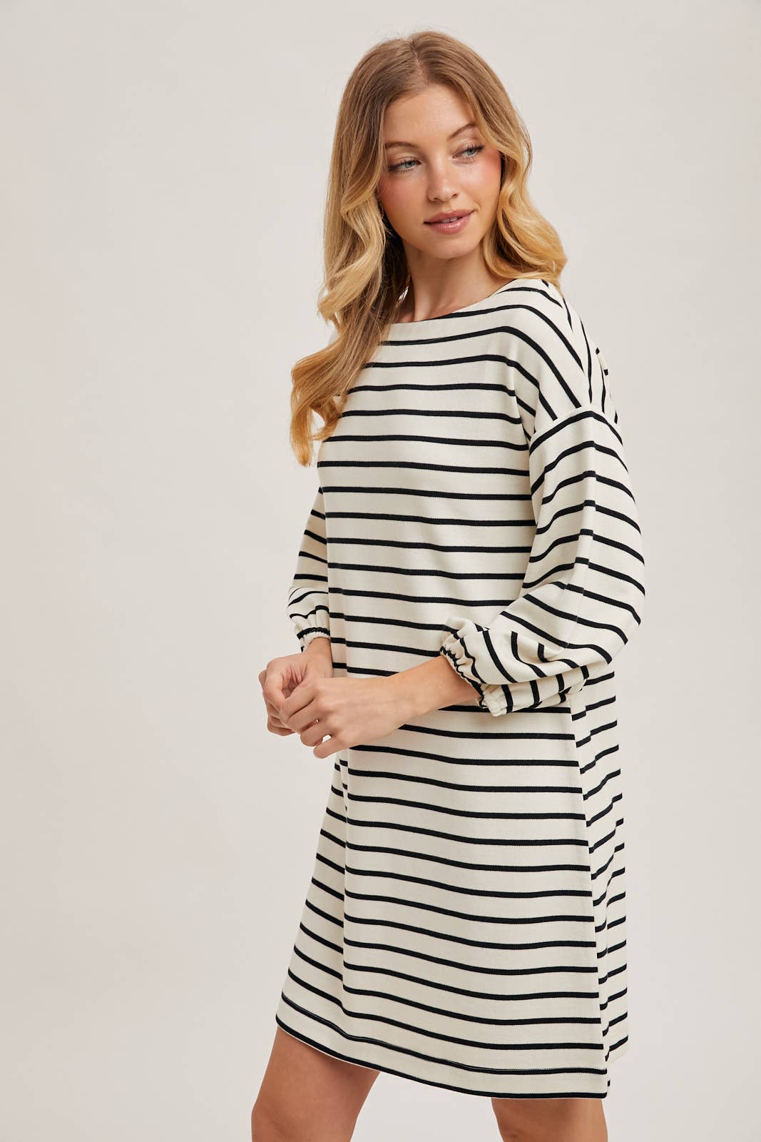 The striped 3/4 sleeved knit dress offers a cozy yet stylish look, perfect for any casual occasion. Made with soft, stretchy knit fabric, this dress provides comfort and a flattering fit. The classic striped pattern adds a timeless appeal, while the 3/4 length sleeves provide a balanced look suitable for various seasons. Ideal for layering or wearing solo, this versatile dress can be paired with sneakers or ankle boots for an effortlessly chic style.