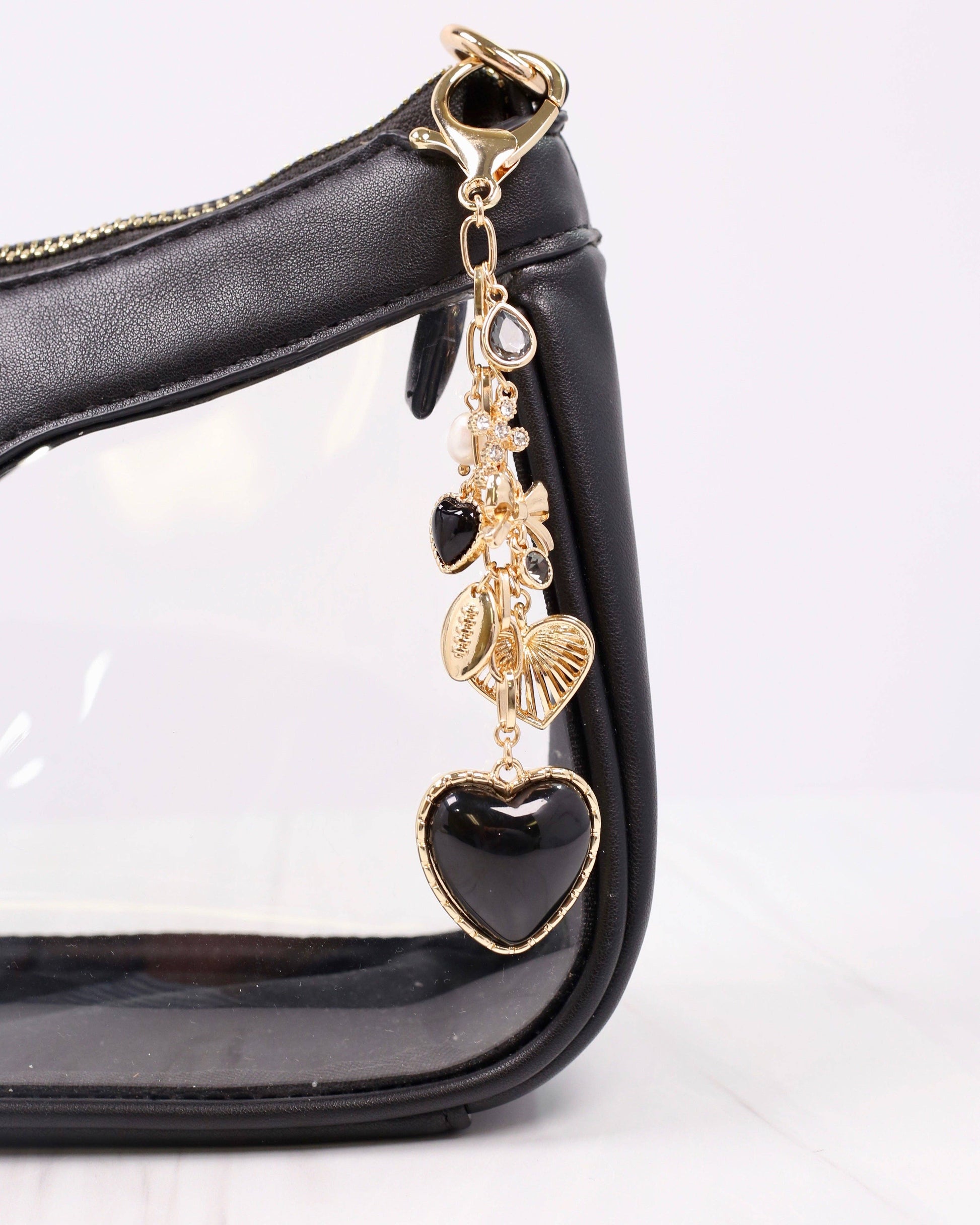 Add a stylish touch to your gameday look with the Sutton Bag Charm in black. This charming accessory features two hearts, a football, a cross, and a clover, making it a versatile piece to brighten your clear bag, use as a key chain, or pair with a scarf for a boot charm. Its playful design adds a fashionable pop of color and personality wherever you choose to wear it.