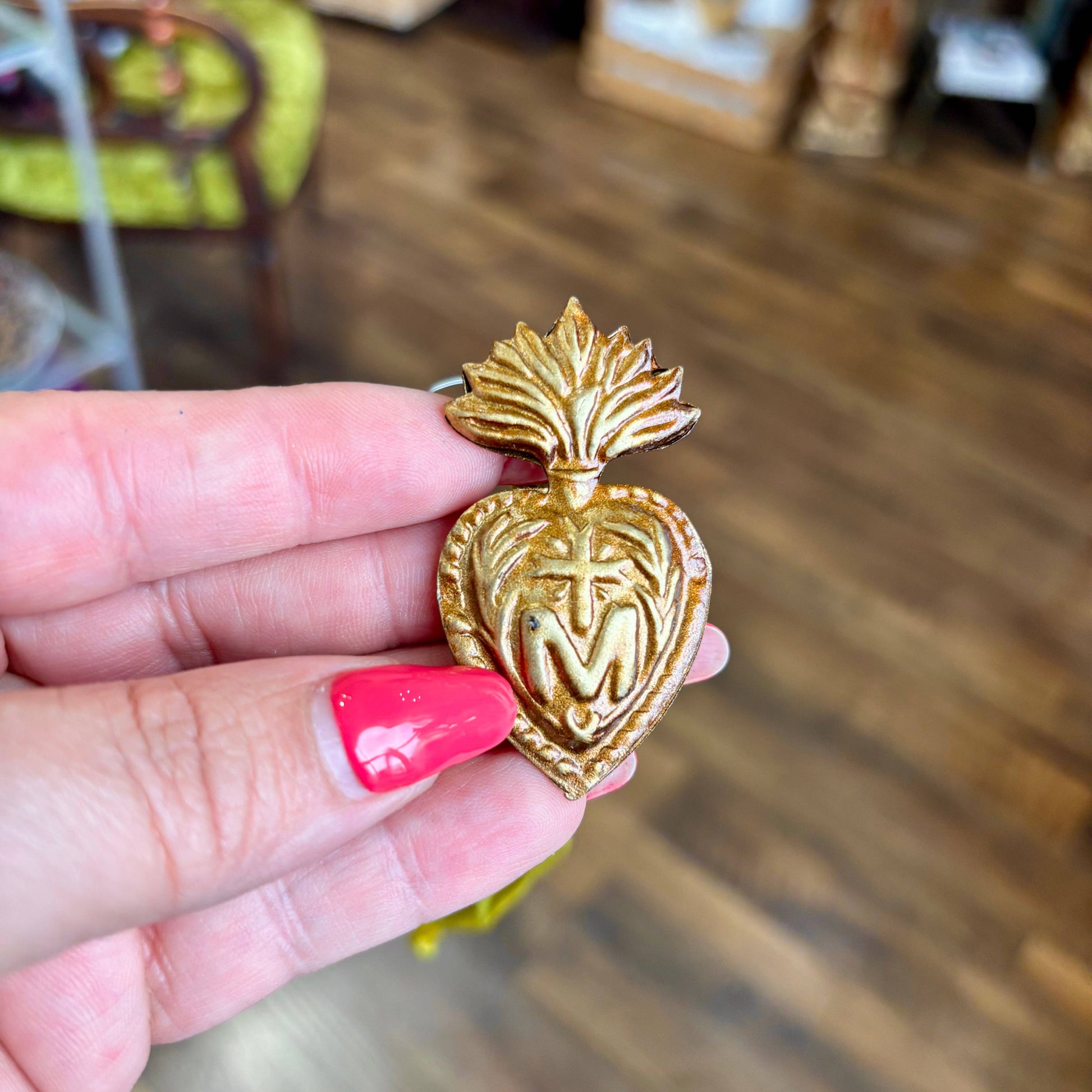 Emblem on these beautiful Sacred Hearts represent "to Jesus through Mary". These are double sided and have a "bubble" look to them. Tin ornaments. Made in India. Antique Gold Color. Available in a variety of sizes.