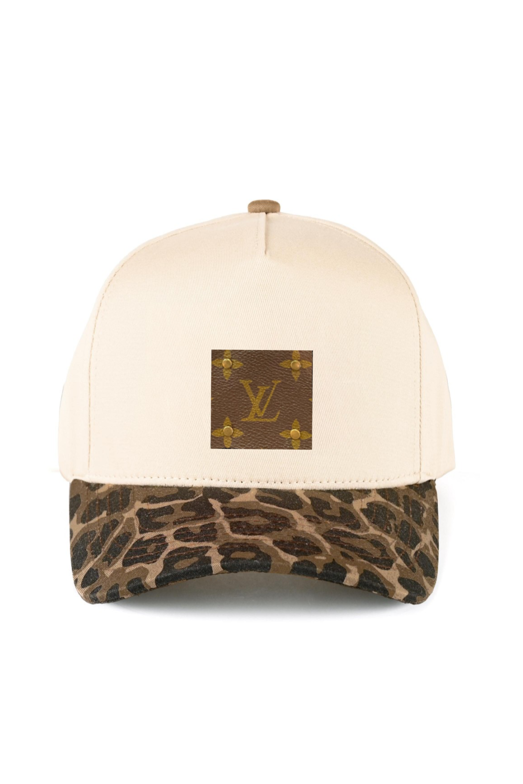 This playful cap combines 100% cotton comfort with a unique twist—upcycled Louis Vuitton materials are carefully adhered and riveted onto the front, creating a chic three-tone leopard print and ivory design. The snap-back adjustable closure ensures a perfect fit for every adventure. Add a touch of bold style to your everyday look with this one-of-a-kind accessory!
