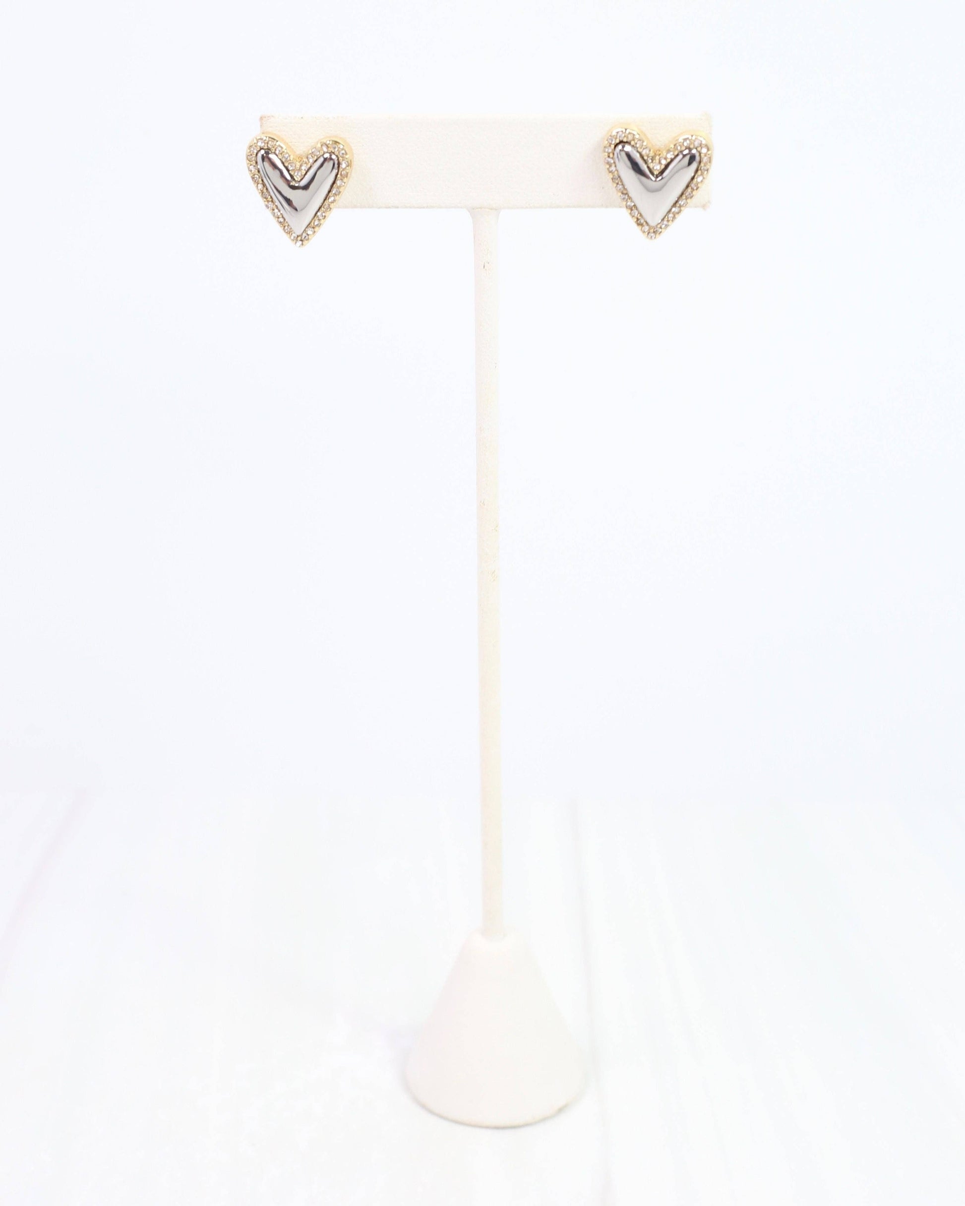Add a touch of sparkle and charm with these Whimsical Puff Heart and Crystal Studs. Featuring a shiny silver puffed heart centerpiece adorned with delicate gold-set pave crystals, these earrings bring playful elegance to any outfit. Perfect for brightening your day with a little shimmer and fun!