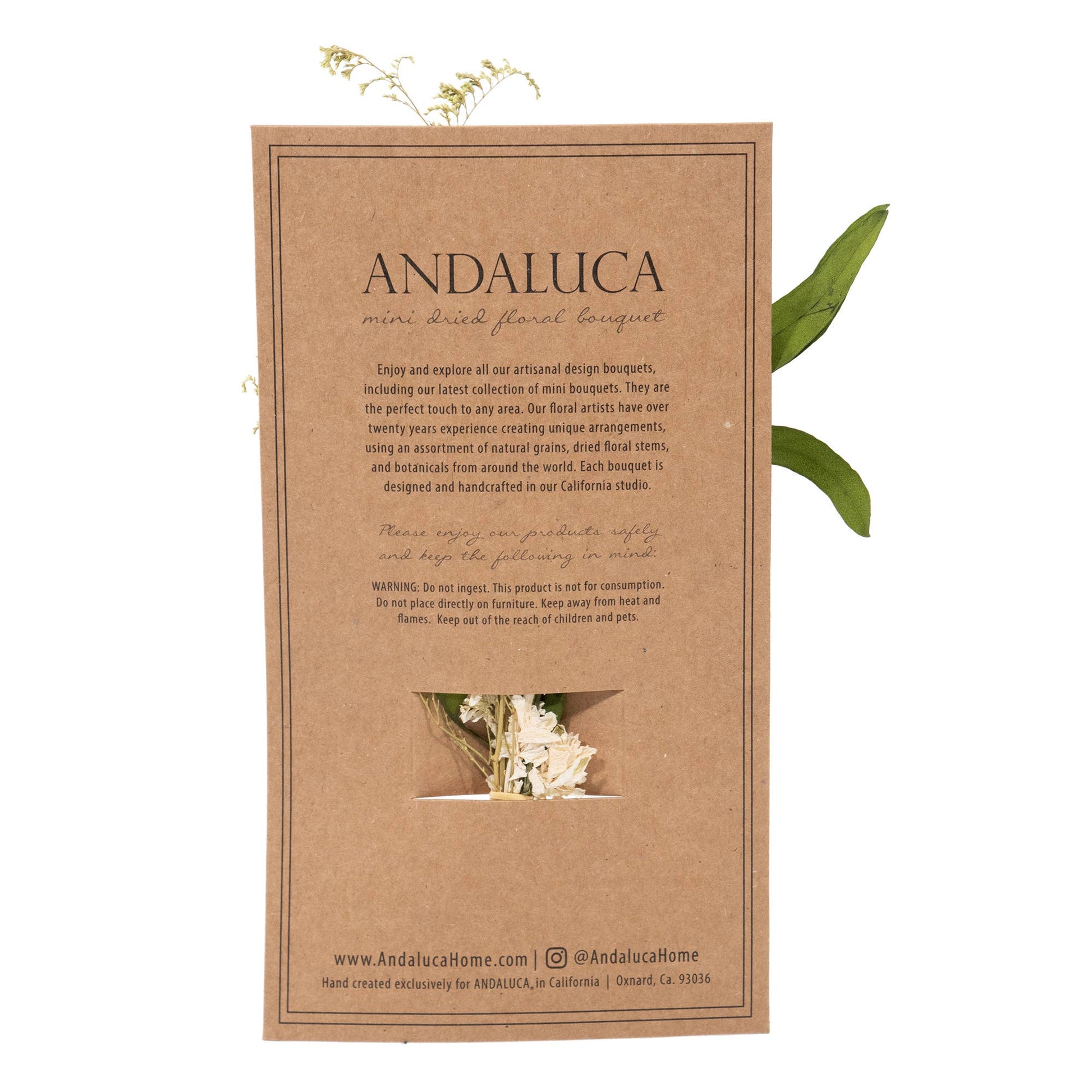 Our floral team designed this beautiful MINI bouquet using an assortment of willow, caspia, linasa, and white larkspur to create this charming and petit mini bouquet arrangement. Each bouquet is designed and handcrafted in our California design studio and is a perfect decorative accent to your tablescape or vignette.