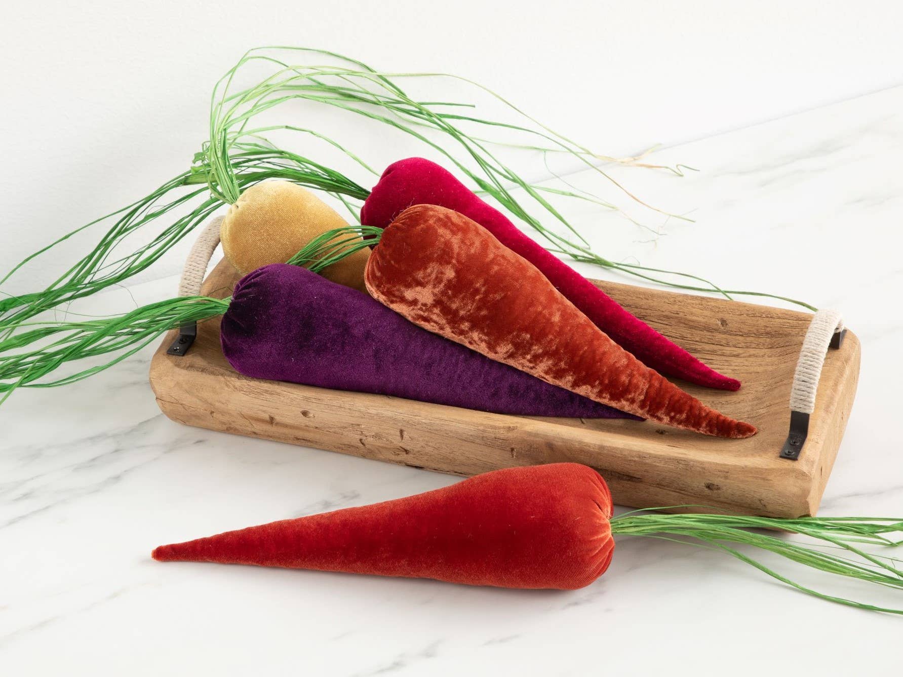 An accent wood tray is the perfect centerpiece to gather your collection of "anything". The vintage-look tray complements rustic, farmhouse, primitive and shabby chic decors beautifully. This rectangle-shaped tray is made of solid wood in a neutral light brown color stain. Each piece of wood is purposely distressed for a rustic style. There are rope-covered metal handles securely screwed into each end.